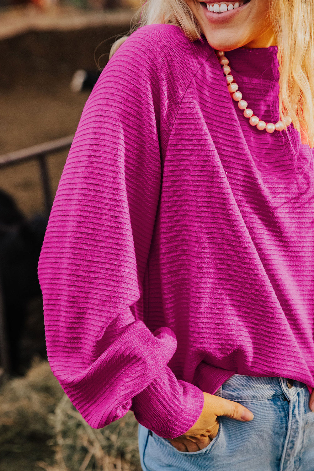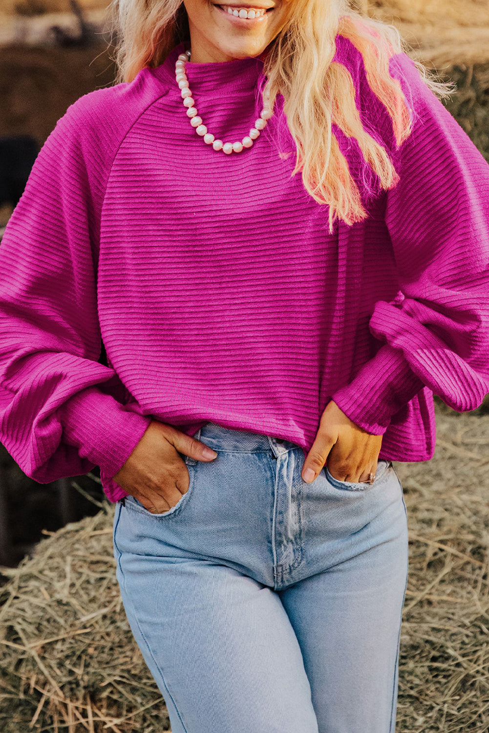 Strawberry Pink Textured Knit Mock Neck Raglan Sleeve Loose Top